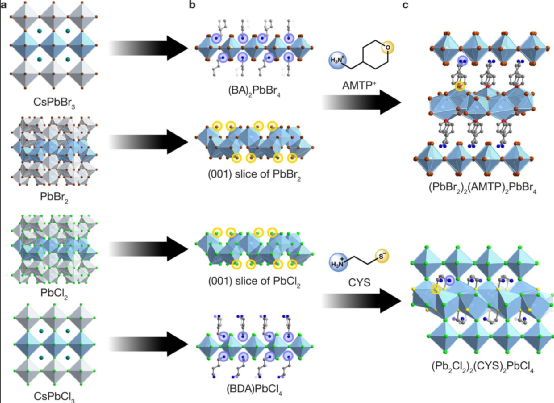 然而,已发现的这些材料的结构多样性是有限的。相比之下,层状有机-无机卤化物钙钛矿以其结构可调性和低温合成而闻名。由A2MX4(A1+ =有机或无机离子;M2+ =金属离子;X1−=卤离子)组成的层状钙钛矿通过降维与3D钙钛矿结构(AMX3)相关:通过添加离子盐去除母晶体结构的一部分(通常是沿晶体平面的薄片)。在层状钙钛矿中,A1+通常是一种烷基铵阳离子,它通过形成有机双层来分隔钙钛矿片层。因此,通过调整有机阳离子的结构,可以预测合成一大类卤化物钙钛矿。