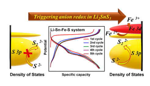 近日,韦恩州立大学Leela Mohana Reddy Arava报道了提出了一种改善金属−配体共价性的替代方法,在正极结构框架中引入一个电负性较低的硫属配体(硫),其中金属d带穿透到配体p带,从而利用可逆的阴离子和阳离子混合氧化还原。通过这种设计策略,研究人员在锂离子导电相(Li2SnS3)中中引入部分填充的d轨道氧化还原对(如Fe2+/3+),从而开发出一类新的层状正极材料。