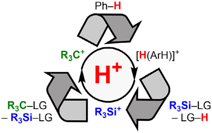 2)作者总结讨论了Lewis超强酸、Brønsted超强酸之间的超强亲电阳离子的催化反应转变(H+、R3C+、R3Si+)如何实现催化反应循环,作者尤其对新发展的R3Si+有机硅试剂的质子化的发展进行介绍。实现这种发展的关键是弱配位能力的对抗阴离子WCA(weakly coordinating counteranions),其中主要讨论组成为[HCB11Y5X6]- (Y = H, Me, X; X = F, Cl, Br, I)的WCA。这种超强酸的酸性比有机合成领域常用的液态Brønsted超强酸(HOTf、HSO3F、HF)更强,而且能够实现传统超强酸无法实现的质子化过程反应。