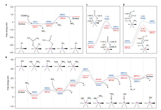 研究人员提出总体UOR反应机理,Ni2Fe(CN)6中的Ni负责尿素转化为NH3和CO2,而Fe负责NH3转化为N2。