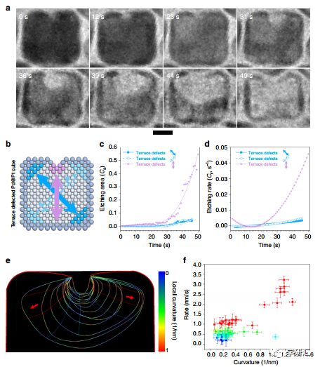 图2. 含有台阶缺陷的立方体刻蚀过程。(a) 随着时间变化,结构进行衍变的具有单个台阶缺陷的Pd@Pt立方体图像,标尺尺寸为5 nm, (b) 原子结构模拟图说明刻蚀区域(Ca), (c) 相对应的散点图和拟合曲线与(d)刻蚀区域,(e) 沿台阶方向的蚀孔时域轮廓图,等高线是按2s时间间隔排列,曲线的颜色表示局部曲率,(f) 蚀刻率与局部曲率的关系。测量尺寸(长度)的误差在±1像素,在推导过程中,计算了曲率和腐蚀速率的误差。