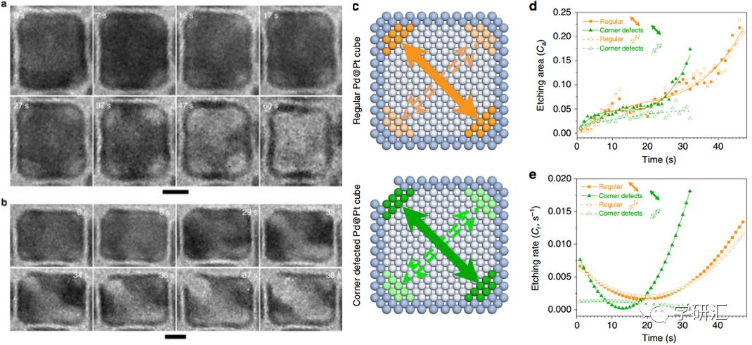 图1. 常规和转角有缺陷的立方体的蚀刻过程。(a, b) 随着时间变化,结构进行衍变的Pd@Pt立方体,(a, b) 分别显示出规则立方体和抹角Pd@Pt立方体内部Pd原子的蚀刻过程。所有面板的标尺都是5nm。(c) 原子结构模拟图说明刻蚀区域(Ca),(d) 刻蚀区域的散点图和拟合曲线,(e) d图对应的蚀刻区域的速率以及与立方体中各方向的对应速率。