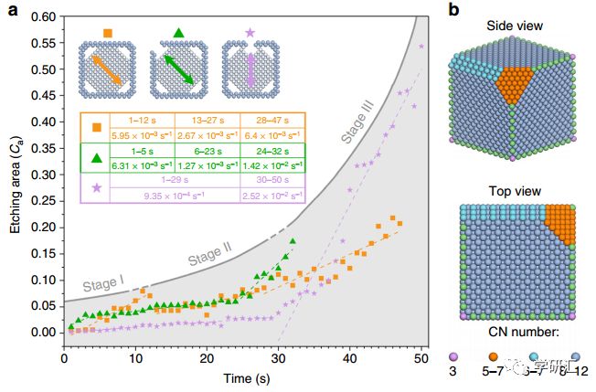 图3. 腐蚀速率和对等数量的立方体。(a) 对于完整的、顶角缺陷和面缺陷的三种立方体结构,沿着固定方向的刻蚀面积随时间变化的曲线。插入表格显示了相应刻蚀时间内的平均刻蚀速率。(b) Pd立方体内表面原子的配位数分布。